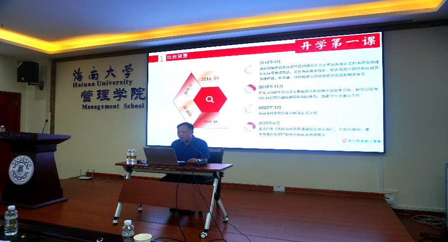 首先,邢谷川书记代表学院对2021级研究生新生的到来表示欢迎。课上,邢谷川介绍了海南自贸港的建设与发展、学院基本情况和发展目标,鼓励同学们用好学院提供的广阔平台,乘着海南自贸港建设的东风实现自我价值。围绕“怎样进行研究生生活建设”这一话题,邢谷川结合身边的学生案例,嘱咐同学们要提前规划研究生生活,并提出了十五条建议,希望大家珍惜研究生三年的时光,不负韶华,不负自己。