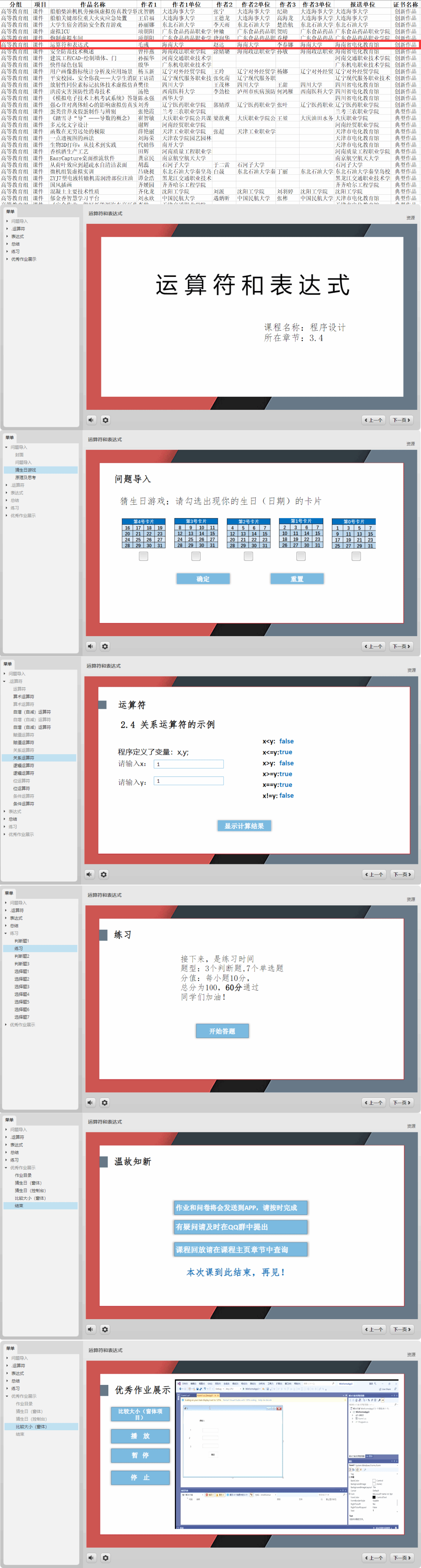毛彧、赵达和李春娜老师的课件《运算符和表达式》获海南省第三十届全省教师教育教学信息化评比课件类一等奖,由省教育厅电化教育馆推荐参加2023年全国教师信息素养提升实践活动(第二十七届教师活动)。经教育部专家评审,最终被评为“创新作品”。这是澳门永利皇宫赌场