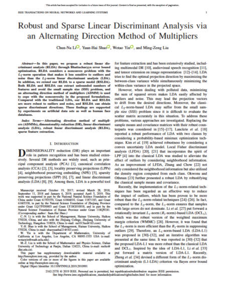管理学院李春娜副教授撰写的“Robust and sparse linear discriminant analysis via alternating direction method of multipliers”在信息处理和智能计算领域顶级期刊《IEEE Transactions on Neural Networks and Learning Systems》(SCI 一区,最新影响因子为11.683) 接收发表。 该期刊为IEEE神经网络协会、IEEE 计算智能协会主办,是IEEE计算智能学会核心刊物,神经网络和学习系统方面的国际顶级杂志。