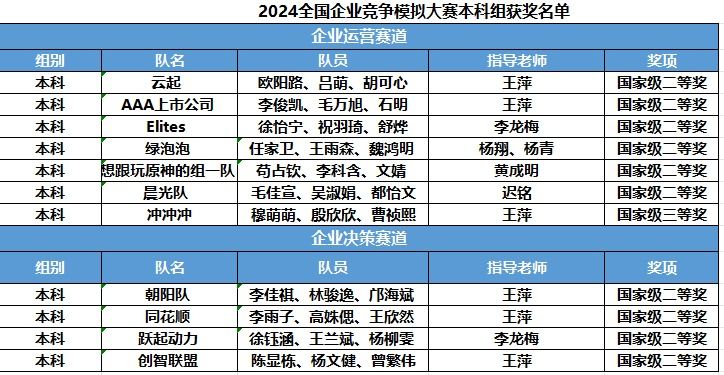 近日来,国际商学院学生在2024年全国企业竞争模拟大赛中荣获佳绩。其中,企业运营赛道获国家级二等奖6项,三等奖1项;企业决策赛道获国家级二等奖4项。