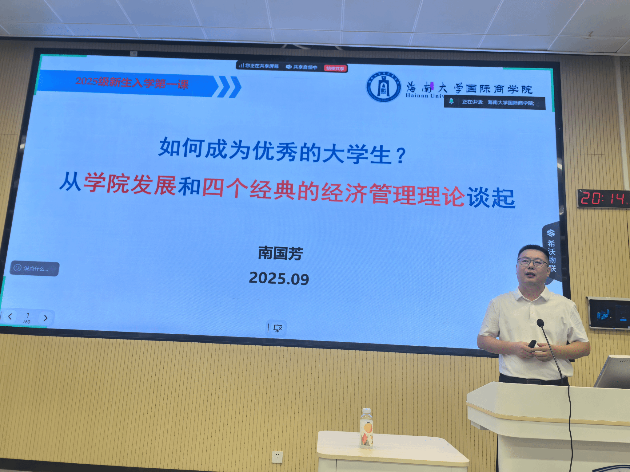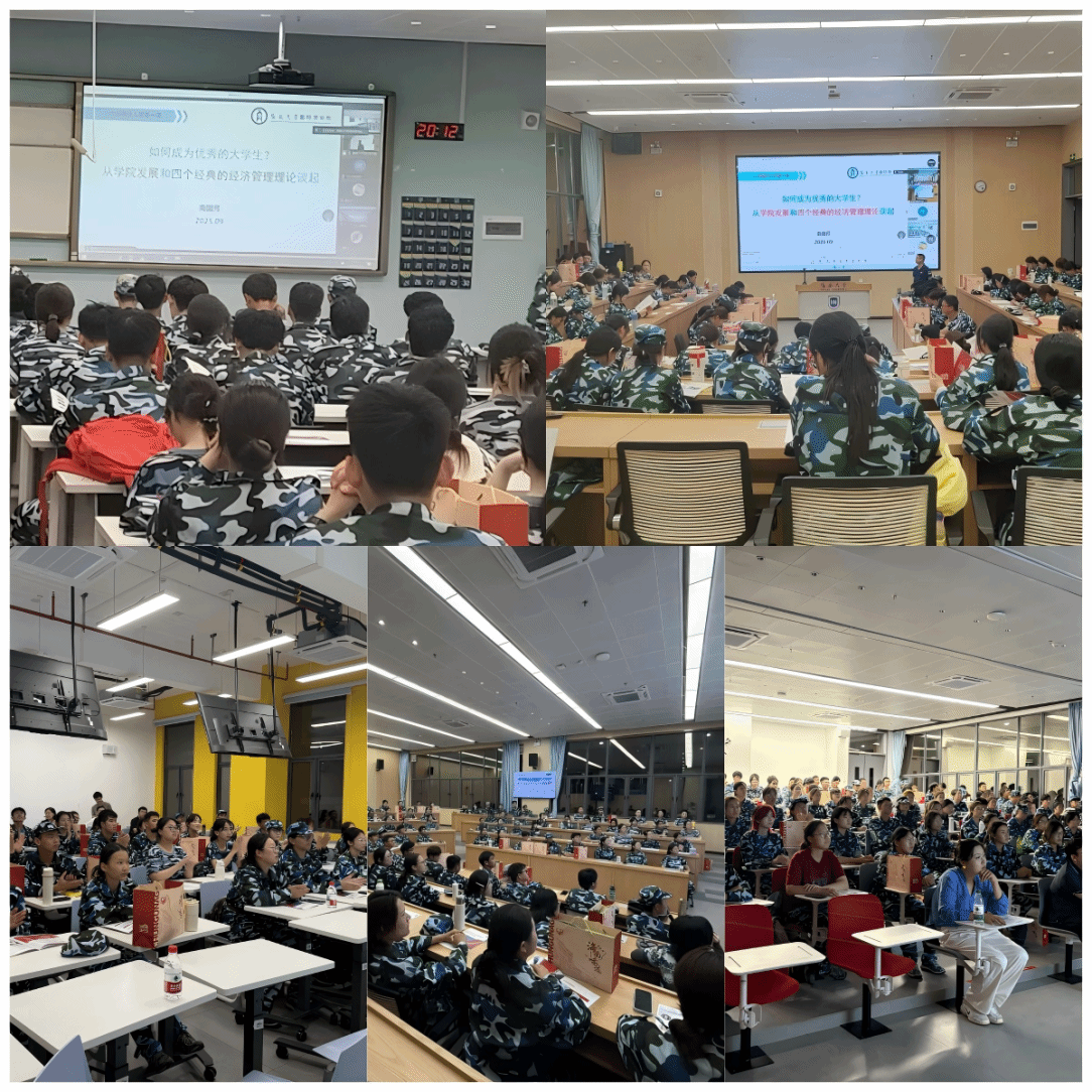 党委书记南国芳以《如何成为优秀的大学生?从学院发展和四个经典的经济管理理论谈起》为题,为全体新生带来了一堂有格局、有前瞻的 “开学第一课”,6 个分会场通过高清直播同步聆听。