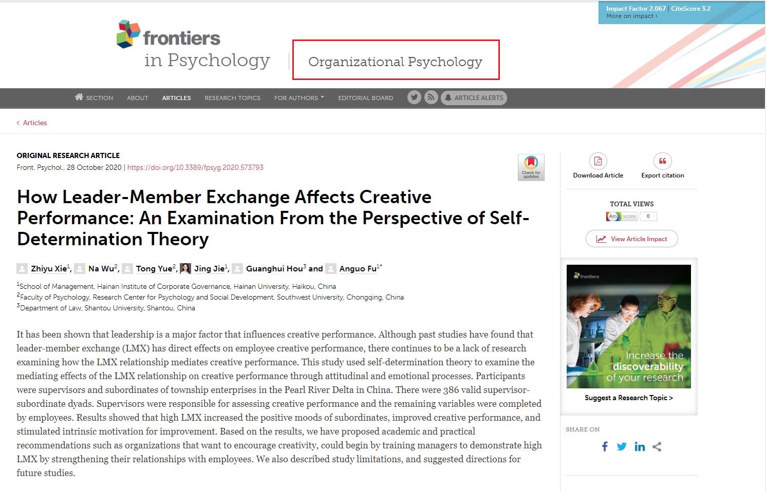 近日,管理学院硕士研究生解智宇以第一作者在国际学术期刊Frontiers in psychology: Organizational Psychology(SSCI二区,IF=2.067)上发表了题为“How Leader-Member Exchange Affects Creative Performance: An Examination From the Perspective of Self-Determination Theory”的研究论文(doi: 10.3389/fpsyg.2020.573793) ,这是澳门永利皇宫赌场