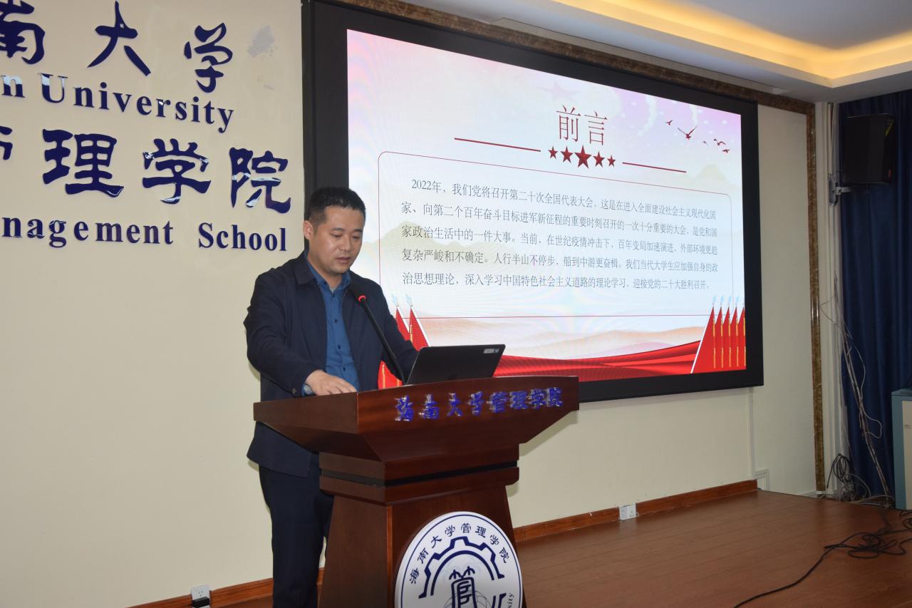 3月1日下午,管理学院于社科楼B112教室召开2021-2022学年第二学期“开学第一课”——爱国主义教育暨安全教育大会,党委副书记易振出席会议,管理学院全体本科和研究生学生干部及班长参会,学生工作办公室主任肖亚奇主持会议。
