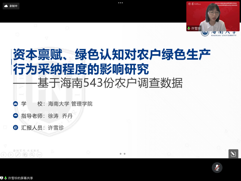 2022年8月20-21日,2022年中国农林经济管理学术年会在中国人民大学召开。为鼓励和培养更多本科生、研究生参与农林经济管理学科的学习和研究,年会特设“农业经济管理类本科生学术论坛暨乡村振兴案例大赛”。来自全国36所高校的百余名本科生、研究生和数十位评委专家,通过线上线下的方式参加了学术论坛和案例大赛。2019级农林经济管理系本科生许雪珍做了题为《资本禀赋、绿色认知对农户绿色生产行为采纳程度的影响研究——基于海南543份农户调查数据》的学术报告。经专家评审,共有6篇论文入选优秀论文奖,许雪珍论文获二等奖。