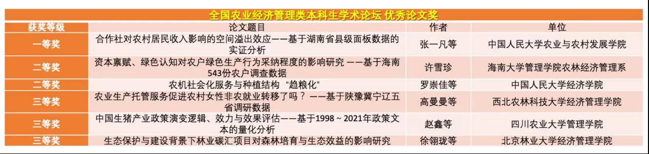 据了解,2022年中国农林经济管理学术年会(Chinese Conference on Agricultural Forestry Economics and Management,CAFEM)由国务院学位委员会农林经济管理学科评议组、教育部高等学校农业经济管理类专业教学指导委员会主办,中国人民大学农业与农村发展学院承办,是中国农林经济管理学科学人的年度学术会议,是一个聚学术性、开放性和引领性于一体的学术交流平台。本届年会共收到投稿论文463篇,共有239篇论文入选会议报告。澳门永利皇宫赌场 师生在投稿方面有所突破,按照第一作者单位统计,共投稿论文11篇,入选年会报告论文7篇,在100余家投稿单位中位列第7位;3篇论文入选本科生学术论坛;1篇论文入选乡村振兴案例大赛(研究生组)。通过参加年会,澳门永利皇宫赌场 师生充分展示了在农林经济管理领域的研究水平,为提高研究生、本科生学术研究能力提供了锻炼机会,对于推动澳门永利皇宫赌场 农林经济管理学科建设具有积极意义。