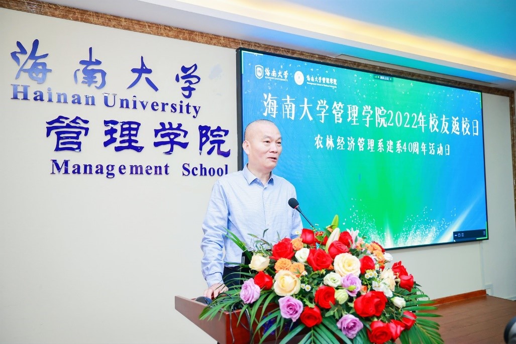 在座谈环节,副校长傅国华教授作了题为“热带农经学科的回顾和展望”主旨演讲,讲述了农经系40年的发展历程、主要成效与贡献以及发展展望。他结合发展的重要节点,从1959年设农业经济组,1980年开始办培训班,1982年设农业经济系等等,深情的回顾了发展过程中的人和事,并对建系教职工、农经系历届校友,学校领导、上级主管部门、海南广东云南三大农垦以及中国热带农业科学院、华南农业大学等单位表达了诚挚谢意。并重点从认清人类发展趋势研究农业,善于理论总结、追求原创,注重特色、创造优势,将论文写在大地上,做优做亮社会服务,用心用爱培养高端人才等方面提出了建议。随后,参会校友围绕“百年变局下海大农经专业发展”这一主题进行自由发言。