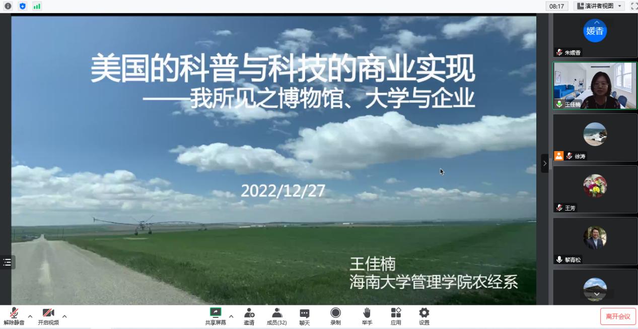 12月27日下午,尖峰热带农经驿站第1期邀请到管理学院农经系王佳楠副教授作了主题为《美国的科普与科技的商业实现——我所见之博物馆、大学与企业》的访学报告。报告会由农经系副系主任徐涛主持,澳门永利皇宫赌场