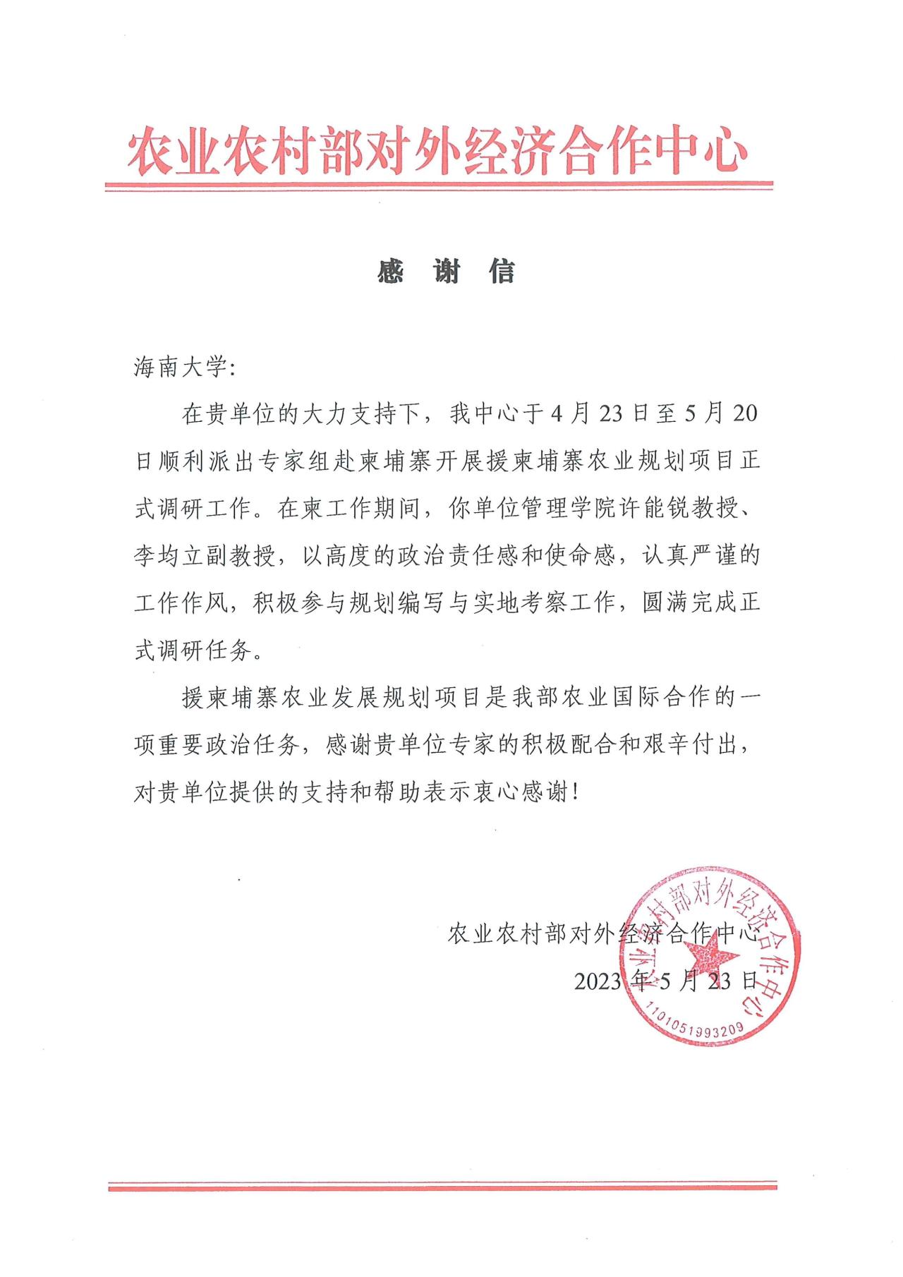 4月23日至5月20日,澳门永利皇宫赌场 许能锐教授和李均立副教授应农业农村部对外经济合作中心邀请,赴柬埔寨开展援柬农业规划项目正式调研工作,主要负责柬埔寨天然橡胶产业发展规划编写与实地考察。在柬工作期间,许能锐教授和李均立副教授并以高度的政治责任感和使命感,认真严谨的工作作风,圆满完成任务,并获得农业农村部对外经济合作中心的感谢信。