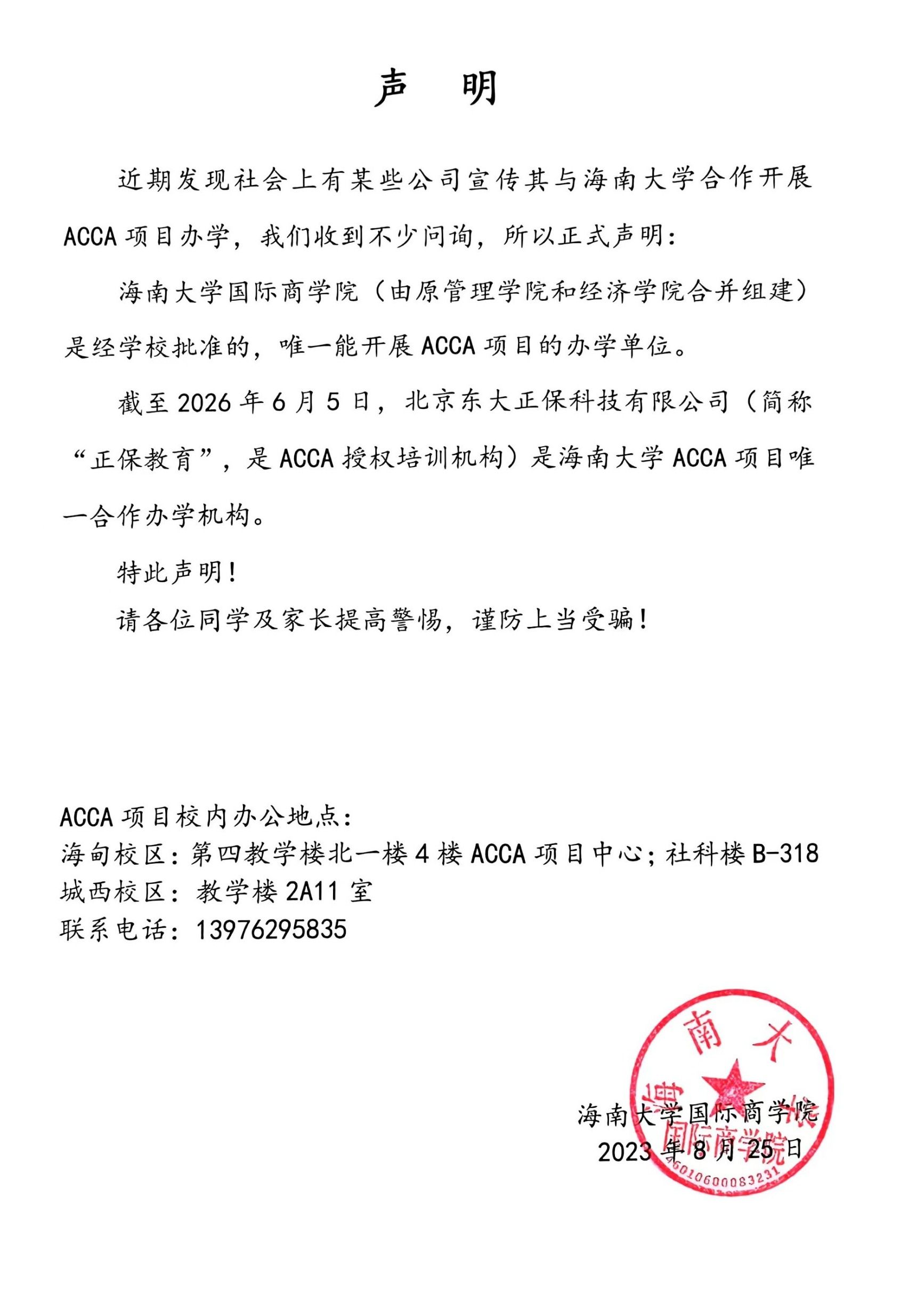 澳门永利皇宫赌场 关于ACCA合作办学机构的声明