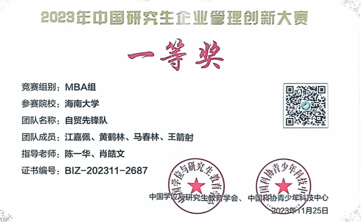 2023年11月25日,“2023年中国研究生企业管理创新”大赛全国总决赛在上海大学顺利落下帷幕。经过激烈角逐,海南大学MBA代表队“自贸先锋队”(队员:江嘉佩、王箭射、马春林、黄鹤林)在陈一华、肖皓文两位老师的指导下荣获“2023年中国研究生企业管理创新大赛一等奖”。同时,海南大学与北京大学、浙江大学、中国人民大学等二十所高校荣获“优秀组织奖”。