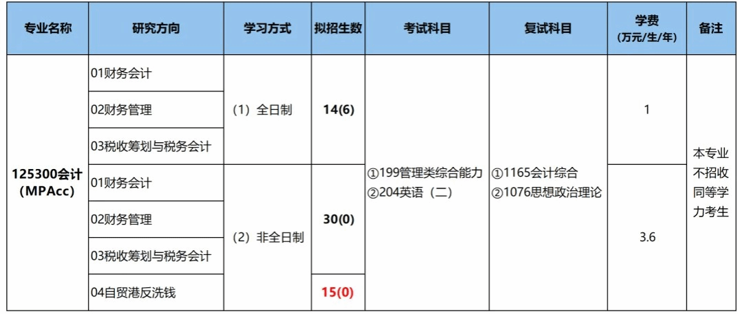 硕士研究生基本学制为3年,非全日制MPAcc的全程学费为10.8万元/生。