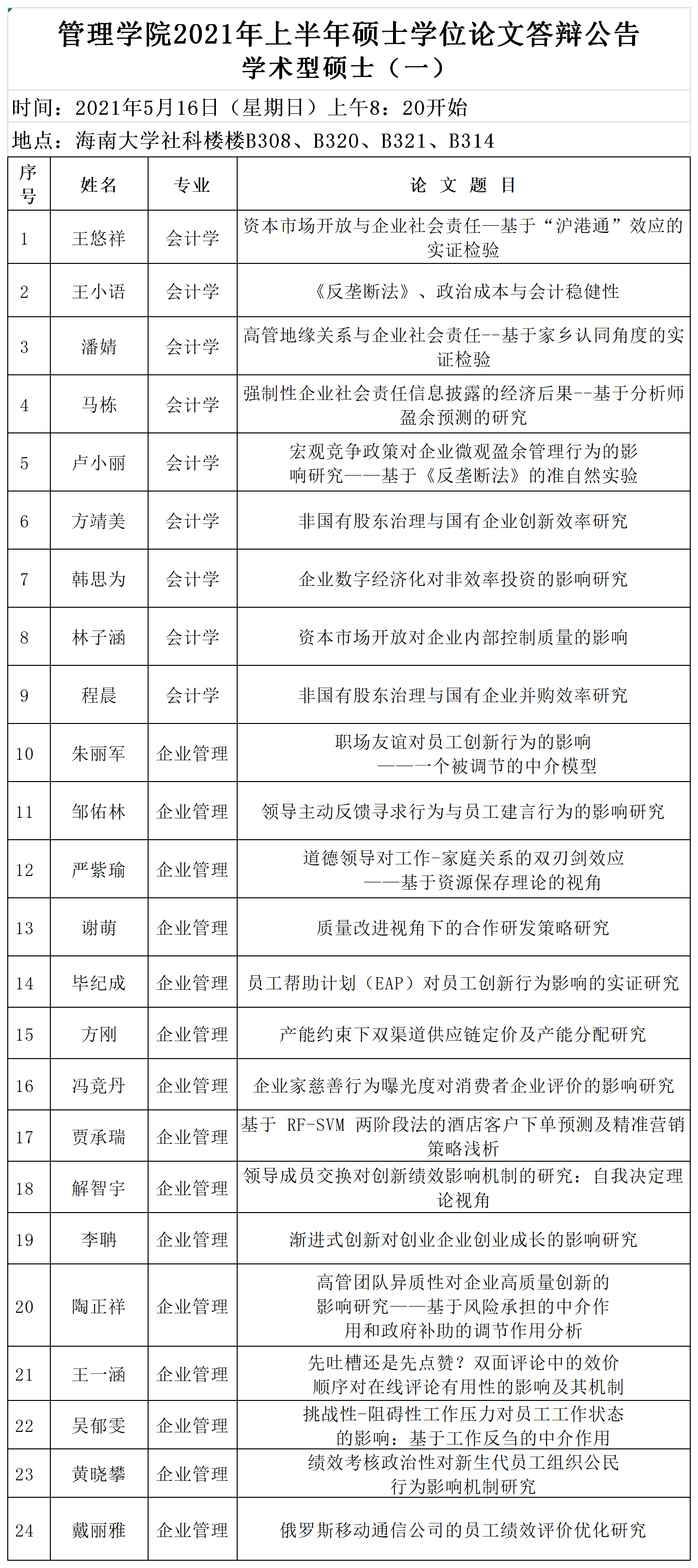 管理学院2021年上半年硕士学位论文答辩公告—学术型硕士(一)