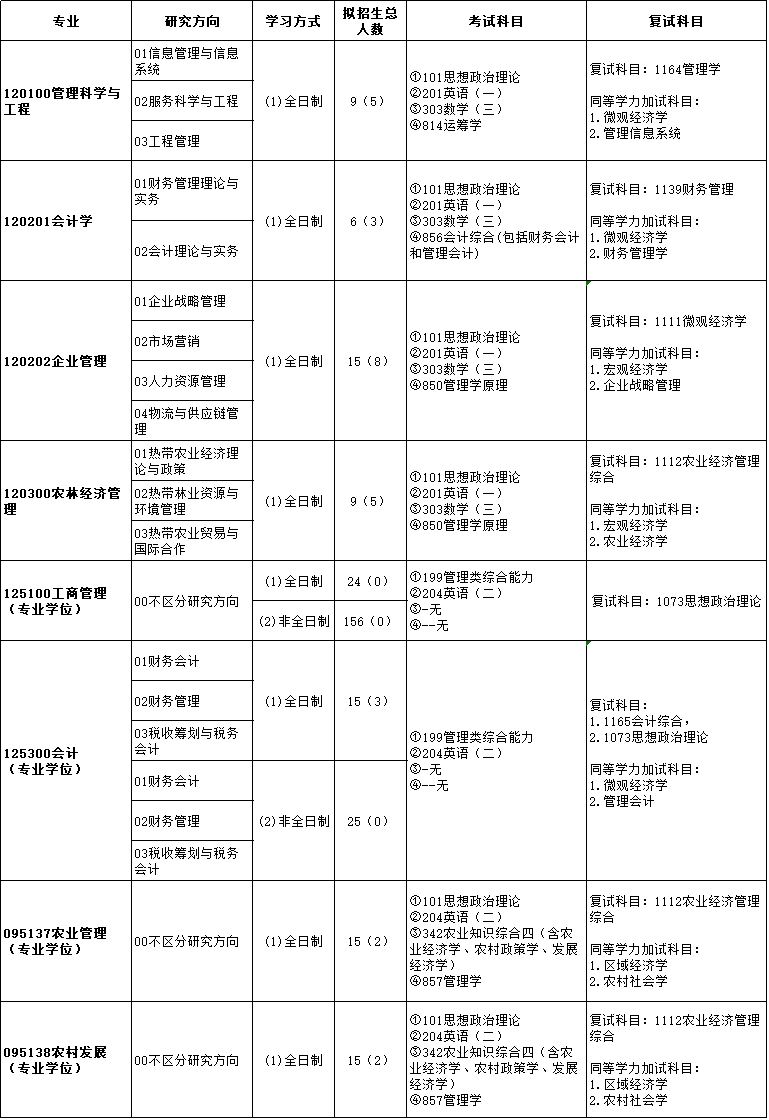 学院目前拥有工商管理一级学科博士学位授权点(研究方向包括:旅游管理、企业管理、财务管理、物流与供应链管理)及博士后科研流动站,工商管理、农林经济管理、管理科学与工程等3个一级学科硕士学位授权点。工商管理作为海南省唯一的经济管理类博士点,系海南省特色重点学科,在2016年的教育部第四轮学科被评估为B级。农林经济管理为海南省重点学科。学院还拥有工商管理硕士(MBA)、会计硕士(MPAcc)以及农业硕士(农村发展和农业管理方向)3个专业学位硕士授权点。