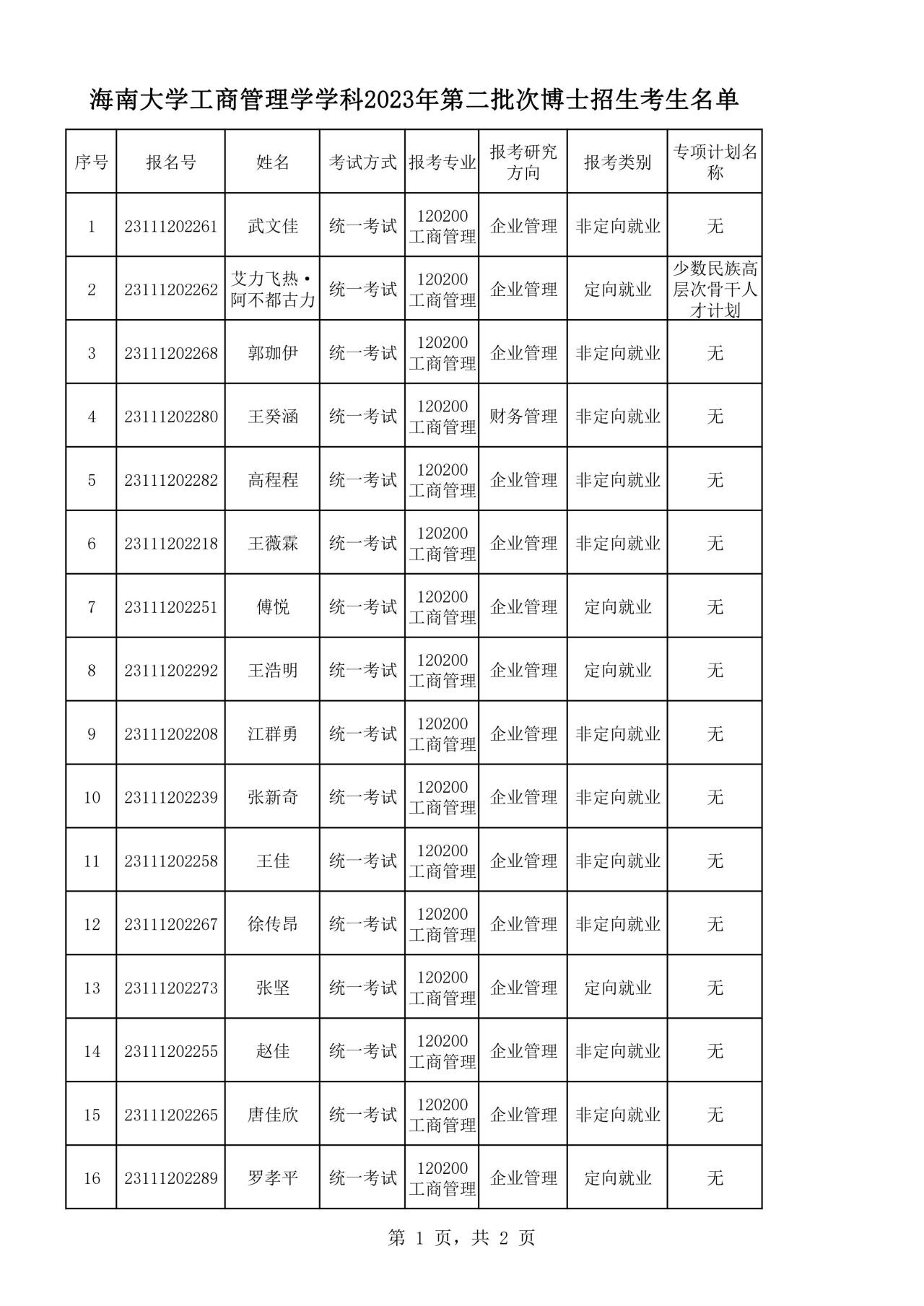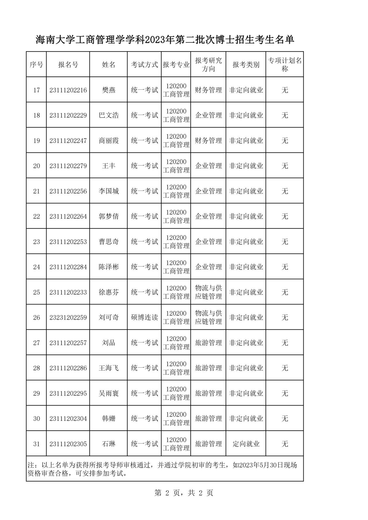 海南大学工商管理学学科2023年第二批次博士招生考生名单