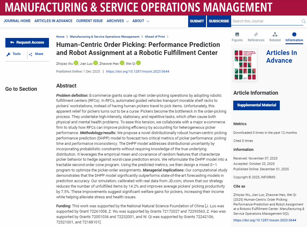 教师罗健教授以通讯作者、第二作者身份,在Manufacturing & Service Operations Management期刊在线发表题为“Human-Centric Order Picking: Performance Prediction and Robot Assignment at a Robotic Fulfillment Center”的学术论文。Manufacturing & Service Operations Management是美国运筹学和管理学研究协会(INFORMS)运营管理类旗舰期刊,同时入选UTD24与FT50,是管理科学领域国际公认的顶尖期刊,隶属澳门永利皇宫赌场