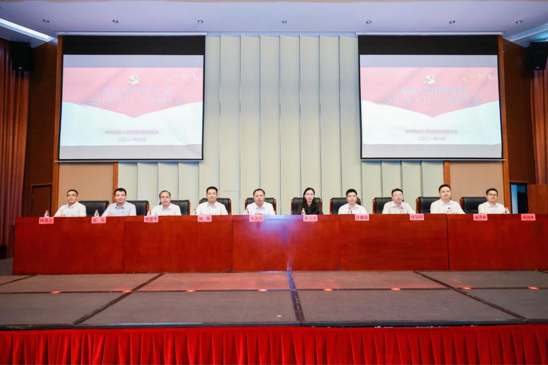 6月29日晚,海南大学管理学院2021年“七一”表彰大会在社科楼报告厅隆重举行。管理学院党委书记邢谷川,院长唐宁玉,学院党委副书记易振,学院党委委员、副院长许能锐,学院党委委员、副院长张德生,学院党委委员、副院长付景涛,学院党委委员、副院长赵达,副院长童泽林,学院党委委员陈赞章、刘扬雄出席会议,会议由易振主持。
