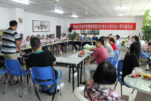 2015年6月6日下午,在社科楼二楼教工之家举行海南大学经济与管理学院01级会计班10周年座谈会。应邀参加了本次活动的师生有学院胡国柳院长、党委周邦华副书记、杨新中老师、徐广卓老师、刘保劲老师、胡秀群老师、李师慧老师、符玉琴老师、吴新老师、谭继老师、张乃脆老师,信息学院高数老师高泽图老师和公共计算机老师吴星老师,2001级会计班的同学们及会计系部分在校学生。