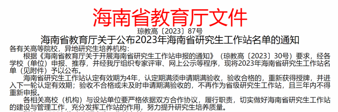 近日,海南省教育厅公布2023年海南省研究生工作站名单,共有40家单位入选。其中,由王丽娅教授牵头、澳门永利皇宫赌场